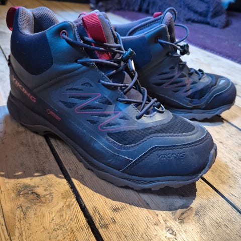 Haglöfs Fottur tursko i størrelse 39 1/3 designet for fotturer. Skoene er brukt 1 gang på tur, føles for små for føttene mine. Skoene har svart overflate med blå detaljer og er laget for å gi støtte og komfort under utendørsaktiviteter. Gummisålen har et mønster som gir godt grep på variert terreng.