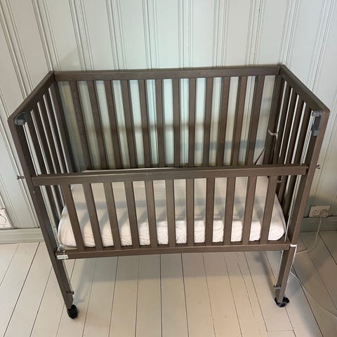 JLY Bedside crib barneseng i grått stoff. Designet for å plasseres ved siden av foreldreseng for enkel tilgang til barnet. Egnet for små barn og nyfødte.