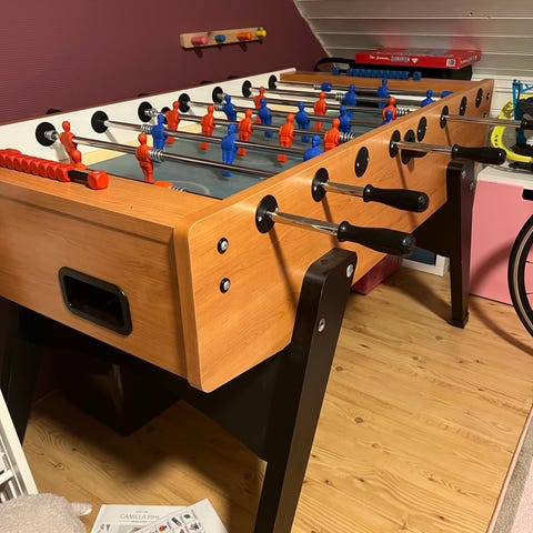 Bordet er kjøpt hos Biljard Import og Service i Norge tidlig i 2022, er lite brukt og har stått i stue hele tiden. I svært god teknisk stand. Alle stenger, spillere og poengtellere fungerer som de skal. Alle ballene medfølger. Stabil konstruksjon med solide bein og god spillefølelse.