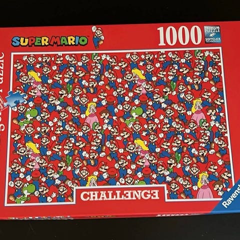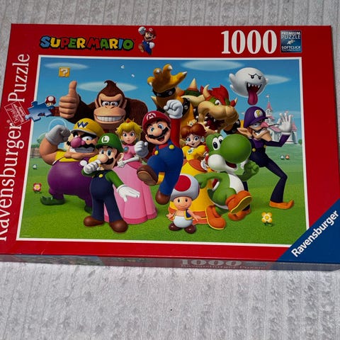 Ravensburger Super Mario puslespill med 1000 brikker. Motivet viser flere karakterer fra Super Mario-universet. Puslet en gang. Komplett. Hentes på Søre ål ved Engesvea