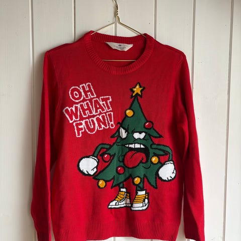 Rød fin genser, brukt som julegenser og en grønn tights selges samlet.