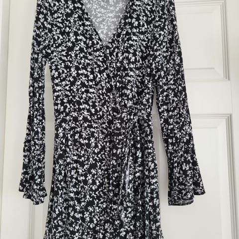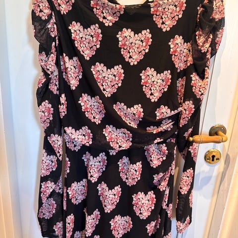 Fabienne Chapot omslagsskjole i størrelse 36, laget av viskose. Kjolen er svart med mønster av hvite hjerter. Den har lange ermer med rysjedetaljer ved mansjettene og nederst på kjolen. Den er foret. Lengden er under kneet.