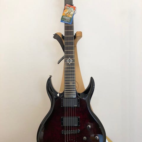 Gitaren er beiset sort med en glatt tre-finish samt nagler I sølv rundt hele gitaren. Perfekt for alle metal/goth band der ute