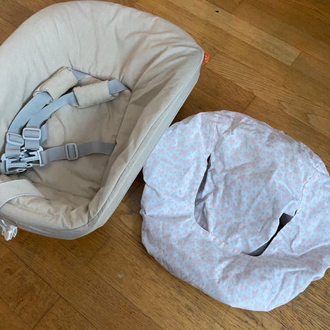 Stokke newborn set med polstret sete og sikkerhetssele. Designet for barn, med justerbare stropper for trygghet og komfort. Bøyle medfølger (ikke avbildet) 🥰