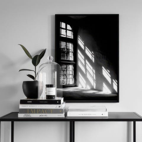 Sett med 7 svart-hvitt naturbilder som viser ulike landskap og motiver som bølger, fjell, skyer og palmer. Bildene har et rolig og minimalistisk uttrykk, egnet for dekorasjon i hjem eller kontor.
