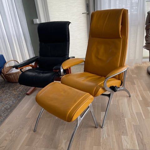 Mørk brun. Understell mørk/ valnøtt. 2 stk stoler og 2 stk krakker. 1000,- per stk.