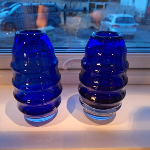 To vaser fra Magnor Glassverk selges helst samlet. En i klart glass, en grålig, litt blank. Den gråblanke har litt større diameter på kragen, og har en luftboble fra produksjonen, ellers er de feilfrie.