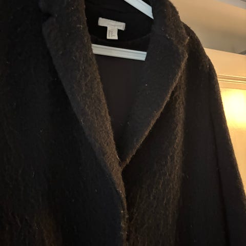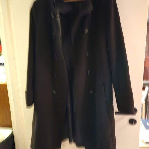 Damekåpe str 46 i boblestoff, tykk og god. Den er liten i størrelsen, mer som str 44. 86 % polyester og 14 % poliamyde. Høy krage med knepping helt opp. Glidelås og knapper over. Foret. Hempe for å henge opp. Lengde fra nakke og ned 91 cm. 2 lommer foran. Varm og god. Kr 445,-. Kan sendes.