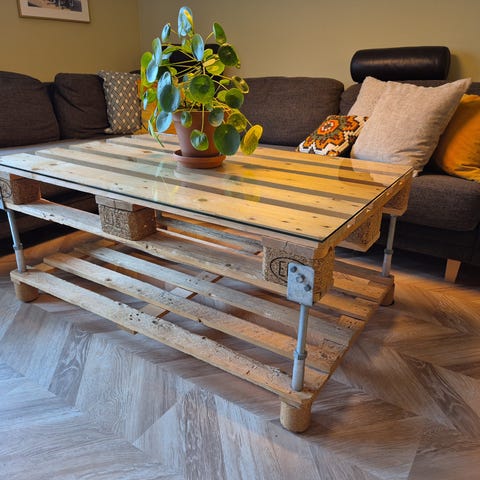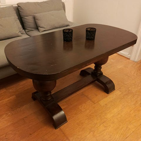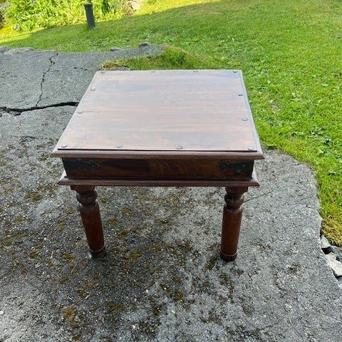 Det er eit fint lite glass bord med metall bein. Det er stødig og så robust som glass kan være. Det kan brettes sammen. Det passer perfekt til nattbord eller eit bord ved siden av sofaen eller noko sånt! Det har fortsatt merkelappen på blei kjøpt for 400kr