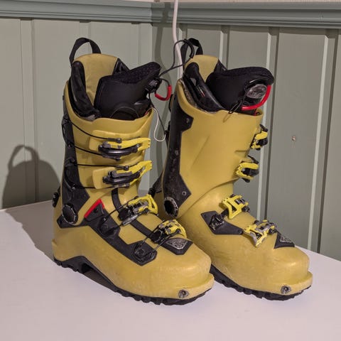 Eldre par med randoneesko/topptursko fra velkjente Dynafit. Skoene er godt og synlig brukt, men har flere sesonger igjen. De er svært lette, men kan fint kjøre mellomtunge ski opptil 110 mm bredde.