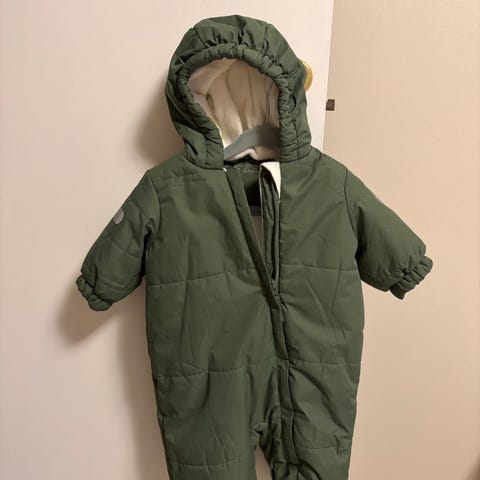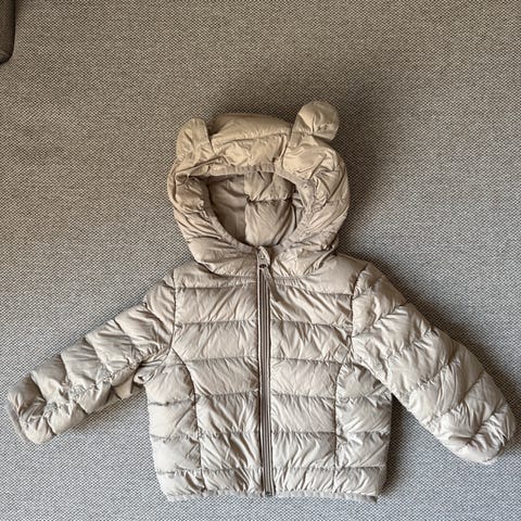 Fin og lett dundress i mørkeblå i str. 74. Ermene kan brettes over og fungere som «votter». 90% dun og 10% fjær. Perfekt i overgangssesongene. Lite brukt.