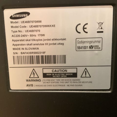 Samsung UE55ES6565 TV med en skjermstørrelse på 55 tommer. Typisk strømforbruk på 84W. Modellen er produsert i Slovakia og har nettspenning på 220-240V, 50/60Hz.