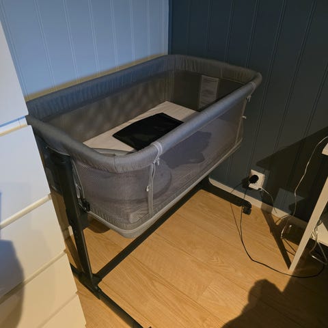 Babybjörn reiseseng i svart farge. Designet for enkel transport og bruk, med nettingpaneler for ventilasjon og synlighet. Passer for barn og har en sammenleggbar konstruksjon for praktisk oppbevaring og bæring.