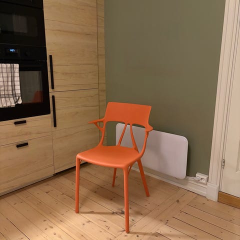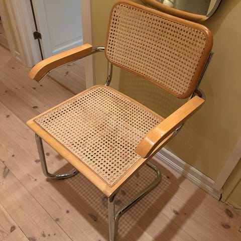 Stolen er brukt og bruksmerker med riper på sete og rygg. Ikke veldig sjenerende og kommer etter vanlig bruk av stolen. Prøvd å ta bilde, men vanskelig å fange opp på kamera.