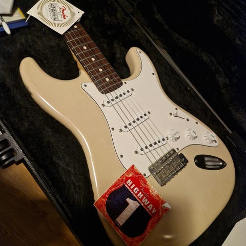 Fender Stratocaster 2018 modell elektrisk gitar i hvit farge. Gitaren har en klassisk kropp og halsdesign, med tre enkeltspole-pickuper og en tremoloarm. Kommer i hardcase fra 4 Sound alt av case candy inkludert, bakplaten følger med og de originale MIM pickuper følger med, sitter nå Seymour Duncan Antiq. Texas Hot, disse knuser alt av andre i å naile SRV lyden , alt som er gjort etter jeg fikk den er gjort av Husemoens Gitar makeri inkludert å montere pickuper, polerte båndene å monterte bein nøtt satt opp i drop D med 10,5-48 Ernie Ball strenger han justerte halsen perfekt også så da er det bare å spille, pris på hot pickup var 3000kr.. kan sende....prisen kan diskuteres...