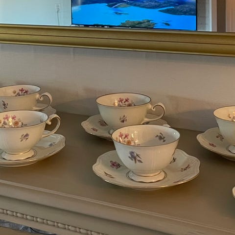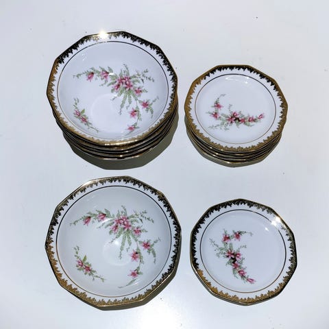 Søkeord: Kaffeservise - Servise - VEB - Tyskland - Germany - Porselen - Vintage - Blomster - Dekor - Gullkant - Gull - Kopp - Skål - Asjett - Kaffe