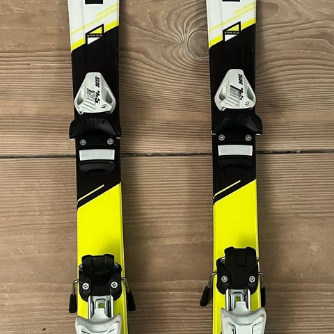 Head Team LP ski med en lengde på 105 cm i fargene rød og hvit. Skiene har integrerte bindinger og et design med grafiske elementer i svart og hvitt.