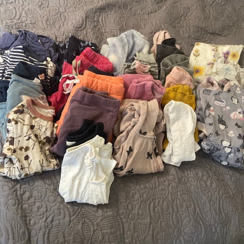 Gir bort klespakke til jente strl 92. 3 genser, 3 tynne gensere (1 ull), 2 bukser og en pysj. Noe slitasje/flekker. Se også andre annonser