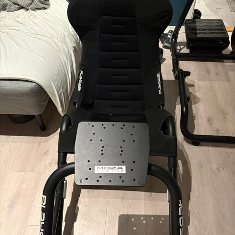 Wheel Cockpit med ratt og pedalsett. Utstyrt med justerbart ratt og tre pedaler. Designet for bruk i racing-simulatorspill. Sort farge med metallramme og polstrede setedeler. Har stått lenge uten bruk så er støvete, utenom det så er den i god tilstand