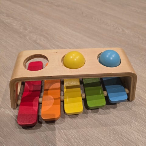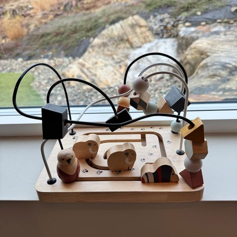 Bamse lekeleke med perler og bondegårdsdesign. Lekeleken har en trebase med fargerike metalltråder og perler som kan flyttes langs trådene. Passer for små barn og kan brukes til motorisk trening og lek.