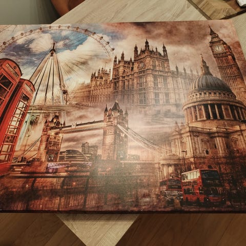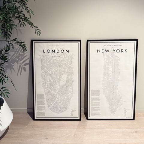 Plakat og ramme med kart over byen London. Bildet viser detaljerte gater og elven Thames.