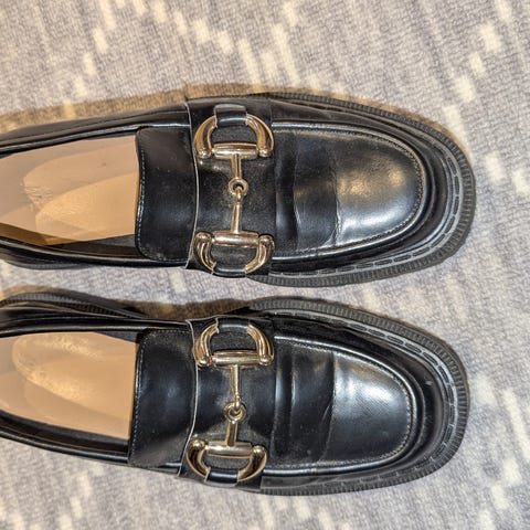 Svarte dameloafers, størrelse 38 EU, i utmerket stand, svært lite brukt. Hentes på Stabekk eller et annet avtalt møtested.