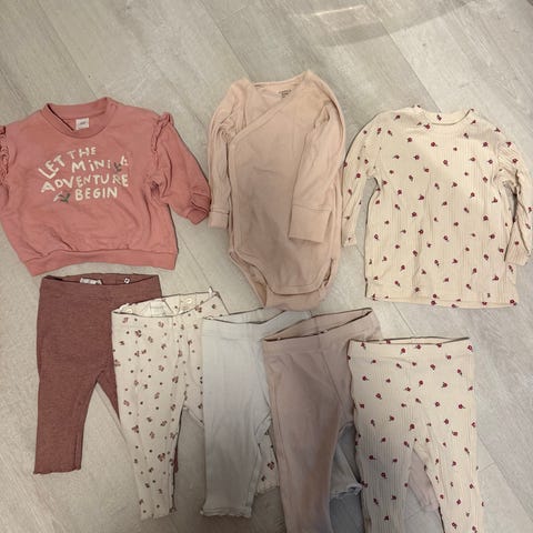 Klespakke til jente i str. 62 med 8 plagg. Inneholder bl.a. bukse fra Polarn O. Pyret og hjemmestrikket ullshorts, samt basisplagg fra Name It, Lindex og Cubus. Pent brukt, røyk- og dyrefritt hjem. Selges samlet.