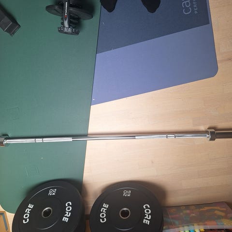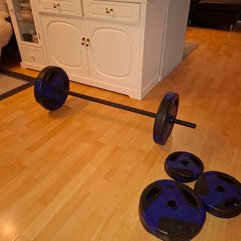 Vektstang og vekter selges da de ikke blir brukt lenger. Stangen har fått noe "rust" belegg på seg.