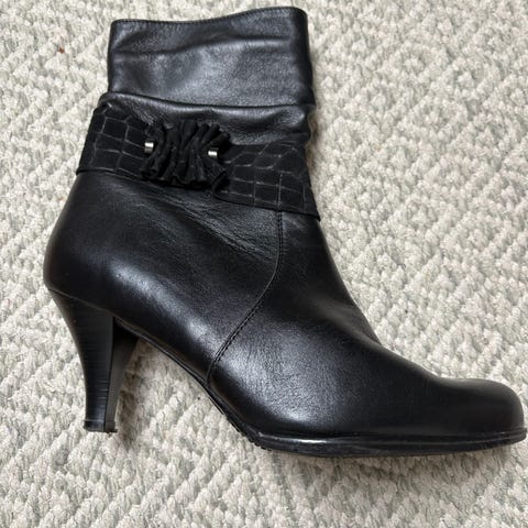 Støvler fra Reko Finland, i brun skinn, størrelse 39. Passer for størrelse 38 m sokk. Støvlene har en flat såle med mønster for grep, og en dekorativ spenne på baksiden. Designet er høyt skaft som dekker leggen. Passer for litt kraftige legger. Har ikke glidelåsåpning.