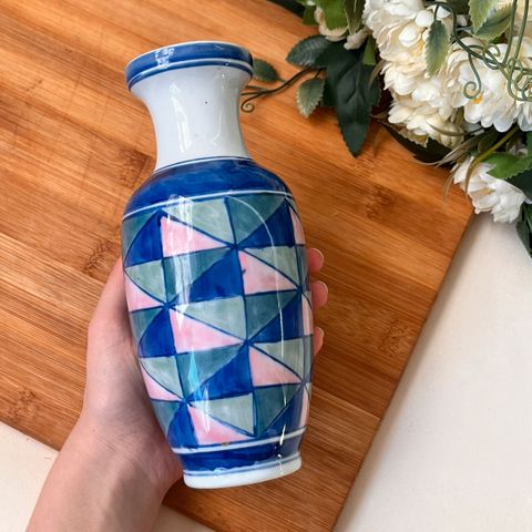 Dekorativ vintage vase i hvitt porselen med håndmalt blått blomstermønster. Fin som pyntevase eller til små blomster. Kan kanskje også funke som en lysestake? ☺️ Se bilder for mål.