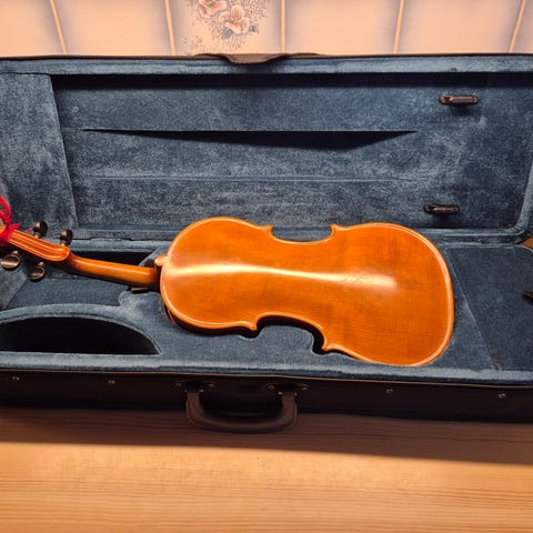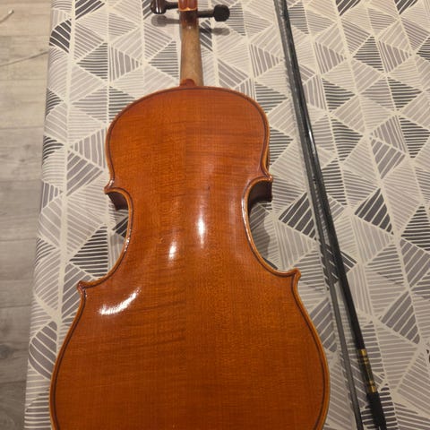 En meget bra begynner/noe viderekommende fiolin, Ingen merkelapp i den, men god lyd og nettspillet. Kasse, enkel bue og skulderstøtte, harpiks følger med.,