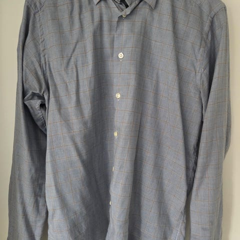 Fin Hugo Boss skjorte til herre. Str. L. Regular fit. Blå med smale hvite striper og prikker.