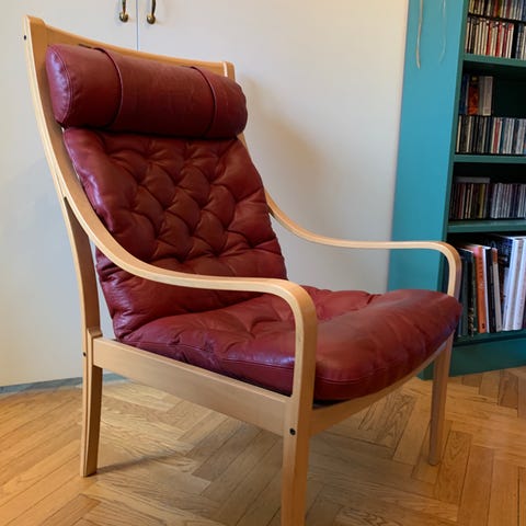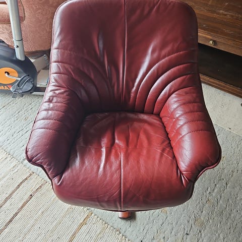 Retro svingstol fra 60/70-tallet i burgunder skai selges. Pen og i god stand, med unntak av en liten skade i skaien.