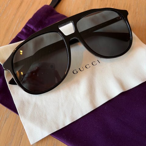 Gucci solbriller. Brillene har svart ramme og mørke glass. Leveres med etui og pusseskinn