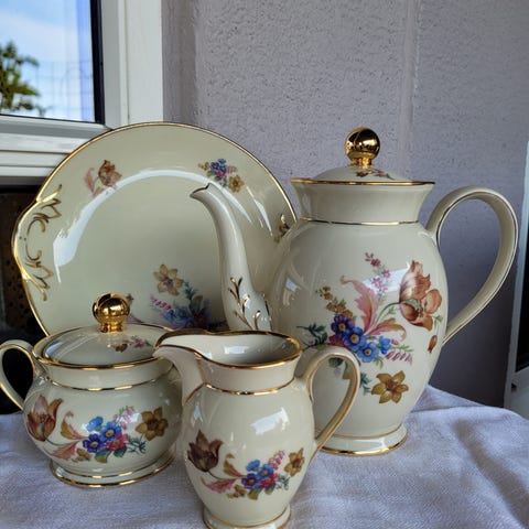 Selges for kr 100 pr sett (kopp,skål,asjett), kaffekanne kr 250, kakefat kr 150, 150 og 125