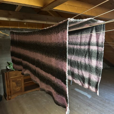 Stripete ullteppe med farger i svart og grått. Passer til bruk som varmepledd eller dekorativt teppe.Størrelse 157 cm x 190 cm hjemme strikket .