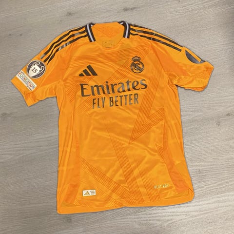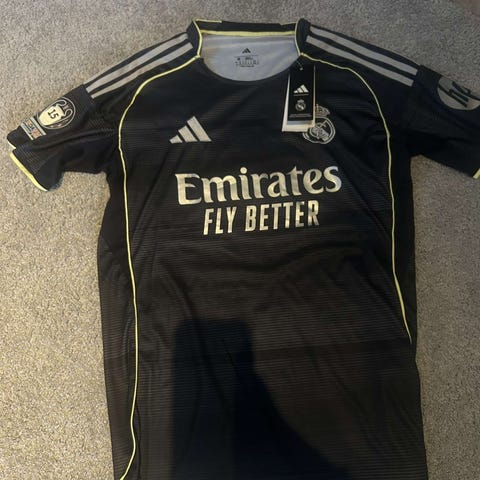 Selger helt ny Real Madrid tredjedrakt for sesongen 2025/26 med Mbappé på ryggen. Drakta har UEFA Champions League-patch på ermet, som gir et autentisk og eksklusivt preg.