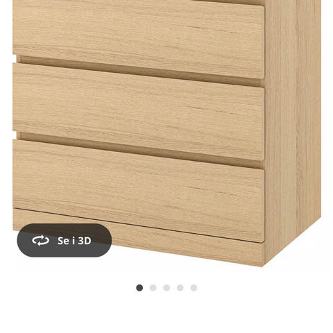 Liten flekk på toppen av kommoden, hvor man bare kan ha noe stående der for å dekke det til. Nederste skuffen lukker seg ikke helt, men kan lett fikses, og påvirker uansett ikke bruk.