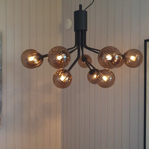 Taklampe med glasskrystaller. Lampen har en rund form med flere lag av glasskrystaller. Egnet for innendørs bruk som belysning i stue eller spisestue. Mangler noen få glasskrystaller.