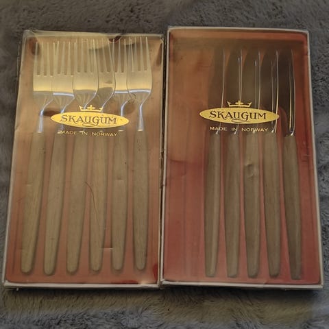Skaugum bestikk i teak. Kniver, skjeer og gafler