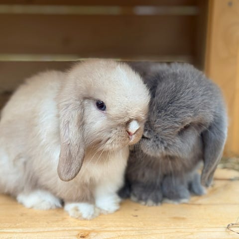 Begge kaninene er veldig kosete, kontaktsøkende og glade i barn og kommer løpende for å hilse på nå vi kommer inn i garden. Er vant til å bruke sele og til å bli bært.