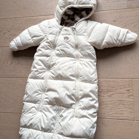 Den kan lukkes med glidelås ned på beina på 2 forskjellige måter, slik at den kan bli brukt i både barnevogn, men også med bilsete for å kunne feste beltet/beltene. Ingen hull eller flekker. Brukt ute i barnevogn 1 gang i 20 min. Etterpå ble det for varmt for å bruke den og babyen har vokst av den. Den er tykk.