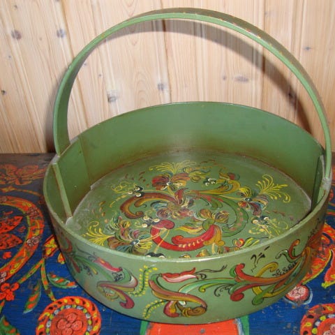 Bollen er rosemalt utenpå og inni som fremgår på bildet, gullkantet rundt og på håndtaket, litt slitt med bruksmerker. Vet ikke opprinnelse og år, men i fra ca før 1950 tallet. Fin til pynt på hytte-bordet/peisen med f.eks mose/tyttebær lyng i.