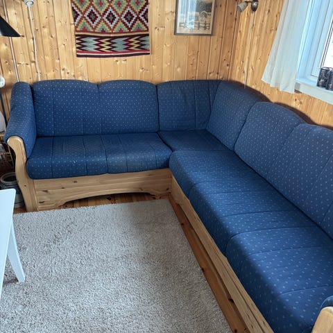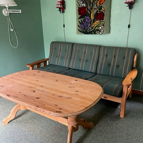 Solid 3 seter sofa, 2stk. lenestoler, ett solid bord og TV-benk i hyttestil selges. TV-benk er fra Dokka Bondemøbler. Øvrig er ukjent, men i samme stil. Noen synlige bruksmerker.