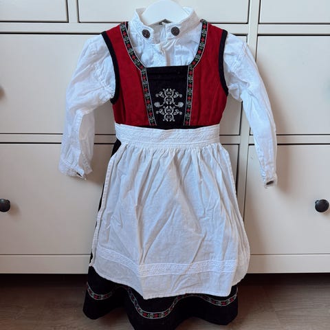 Flott småtroll festdrakt størrelse 8 - 9 mnd men brukt fra 6 mnd til 2 år her. Altså fra størrelse 74 og til og med altså ut 86 her. Veldig snau ved 92 men gikk an for oss. Se bilder for tilstand
