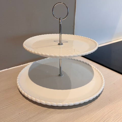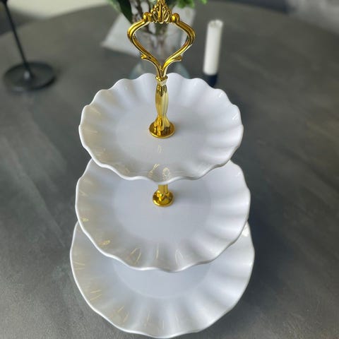 Det er i hvit høyglans stentøy, tre etasjer med sølvkant.