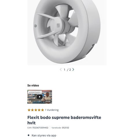 Flexit Bodo Prime baderventilator i hvit farge med en diameter på 100 mm. Ventilatoren er designet for bruk i baderom og har funksjoner som lavt lydnivå og enkel montering.