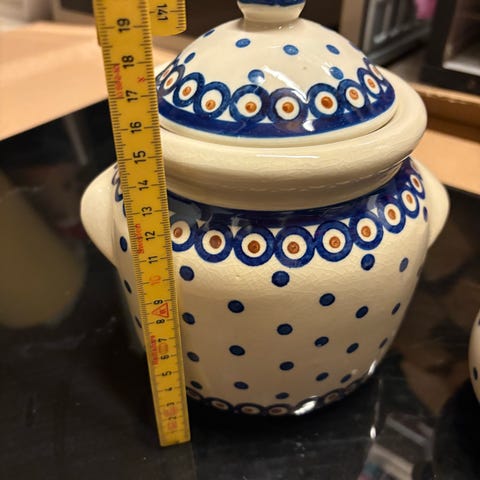 Høyde 9 og diameter 6,5 cm.