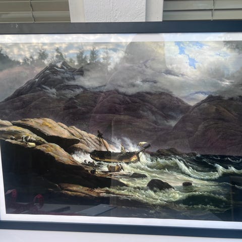 Reproduksjon av maleriet Fjellgård (1838) av J.C. Dahl (1788-1857). Maleriet viser et landskap med fjell, trær og bygninger, innrammet i en dekorativ gullramme.