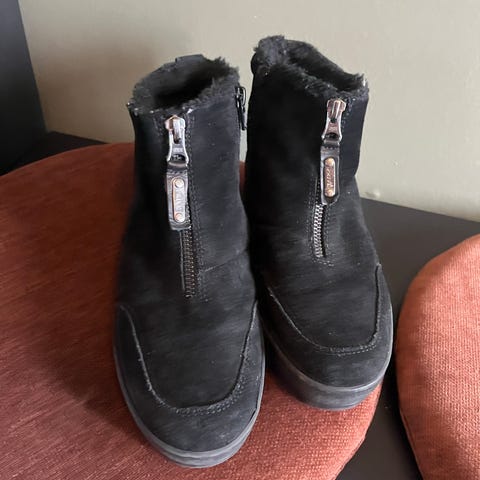 Lite brukt. Brun farge. Noe bruksmerker på sålene (se bilder), som er naturlig da de er brukt utendørs. Myke og komfortable.